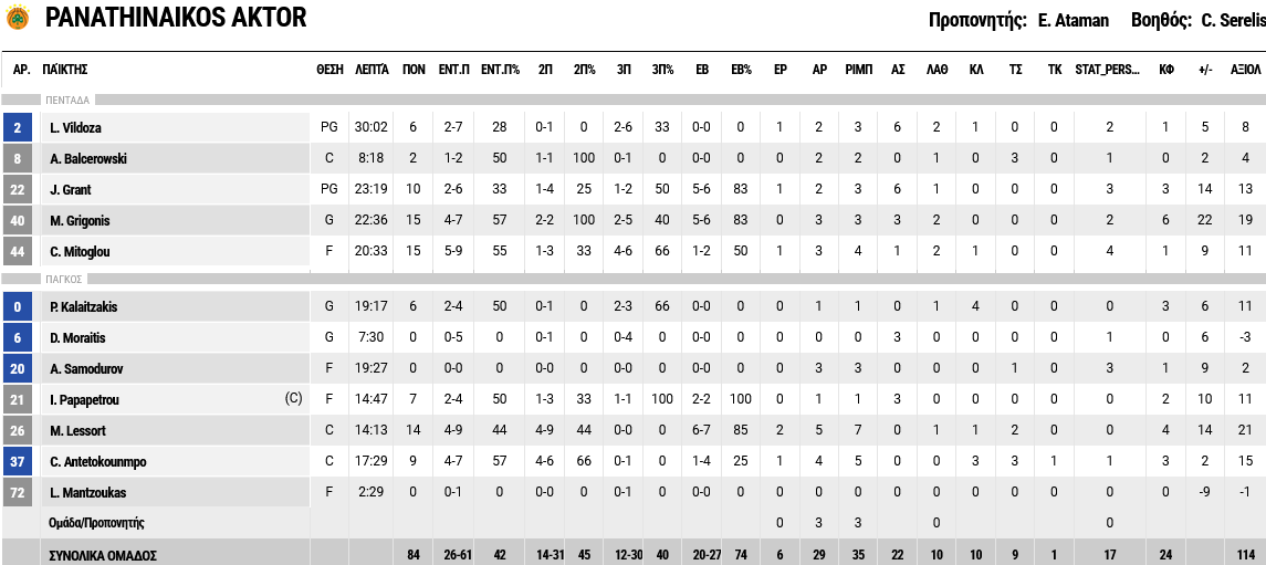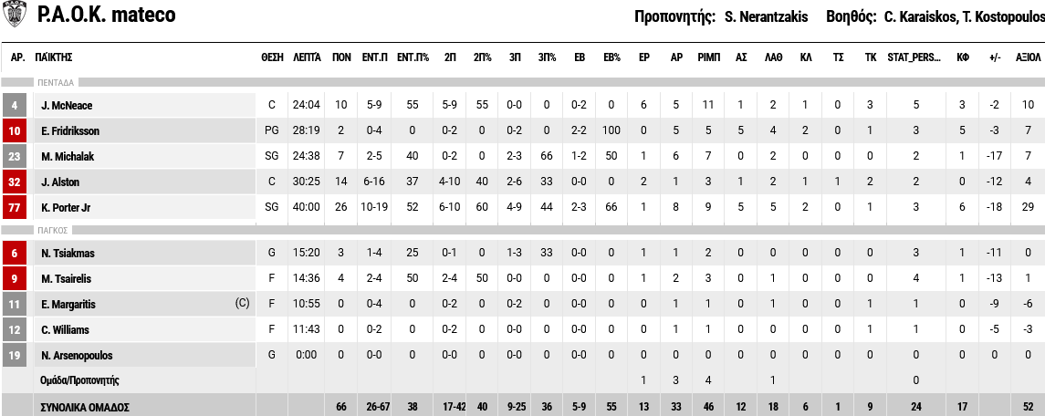 Ξεχώρισαν: Γκριγκόνις και Μήτογλου είχαν από 15 πόντους έκαστος, με τον Λεσόρ να ακολουθεί με 14. Για τον ΠΑΟΚ, εκτός του Πόρτερ, ξεχώρισε και ο Άλστον με 14 πόντους, αλλά και ο ΜακΝίς με 11 πόντους και 10 ριμπάουντ.