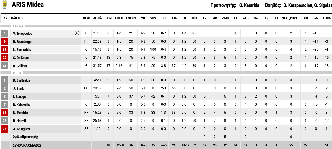 Ξεχώρισαν: Ετσενίκε και Ρέινολντς είχαν από 13 πόντους έκαστος, με τον Χέιλ να προσθέτει 12 πόντους και τον Κάουαν 10. Για τον Άρη, ο Γκάλινατ είχε 17 πόντους και ο Ντε Σόουζα 13.