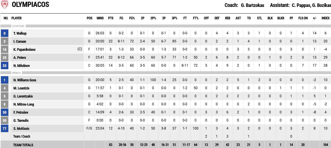 Οn fire: Κάνααν και Πίτερς ήταν… όλα τα λεφτά για τον Ολυμπιακό, έχοντας από 22 πόντους έκαστος (με 6/7 και 5/7 τρίποντα αντίστοιχα) και τον Αμερικανό φόργουορντ να έχει και οκτώ ριμπάουντ.