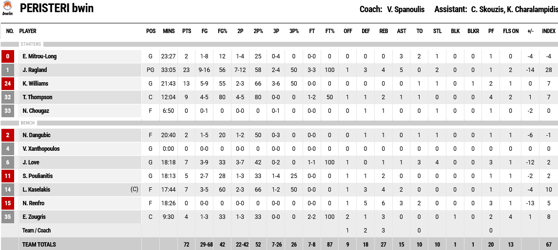 Ξεχώρισαν: Πολύ καλή εμφάνιση από τον Μιλουτίνοβ με 14 πόντους και εννιά ριμπάουντ, ενώ 12 πόντους είχε ο ΜακΚίσικ. Για το Περιστέρι, ο εξαιρετικός Ράγκλαντ είχε 23 πόντους και ο Γουίλιαμς 13.