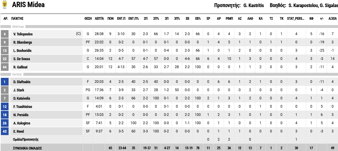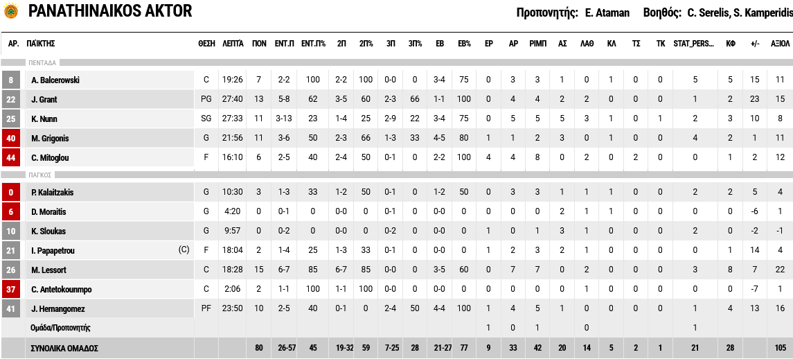 Ξεχώρισαν: Ακόμα μία μεστή εμφάνιση του Γκραντ με 13 πόντους, από 11 είχαν οι Ναν και Γκριγκόνς και 10 ο Ερνανγκόμεθ. Για τον Άρη, Ντε Σόουζα και Γκάλινατ είχαν από 12 πόντους, με τον πρώτο να έχει και 10 ριμπάουντ.