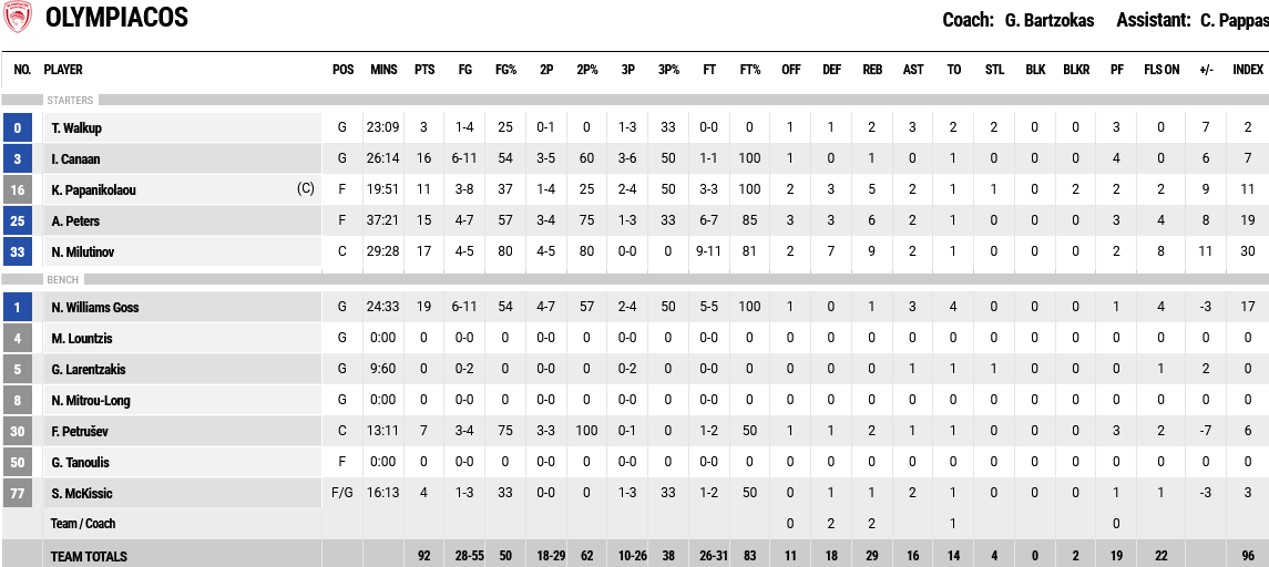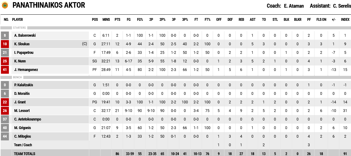 Ξεχώρισαν: Εξαιρετικός ο Γκος με 19 πόντους, με τον Κάνααν να έχει 16 πόντους, 11 στην τέταρτη περίοδο. Για τον Παναθηναϊκό, 21 πόντους και εννέα ριμπάουντ είχε ο Λεσόρ και 13 ο Ναν.