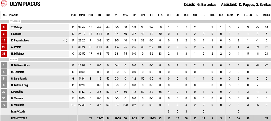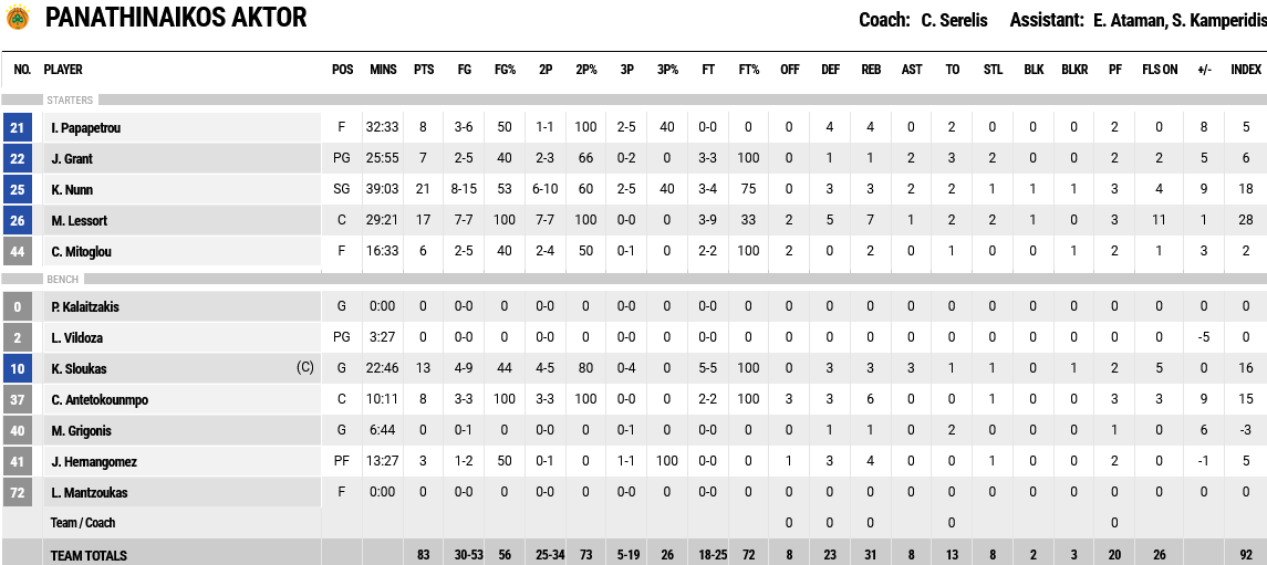 Ξεχώρισαν: Ακόμα μία εξαιρετική εμφάνιση από τον Λεσόρ με 17 πόντους και επτά ριμπάουντ. 13 πόντους είχε ο Σλούκας, ενώ τεράστια ήταν η συνεισφορά του Αντετοκούνμπο με 8 πόντους και 6 ριμπάουντ σε 10’. Για τον Ολυμπιακό, ο Μιλουτίνοβ ήταν για ακόμα ένα ματς ασταμάτητος με 17 πόντους, με τον Κάνααν να έχει 14 και τους Πίτερς και Γουόκαπ από 10 έκαστος.