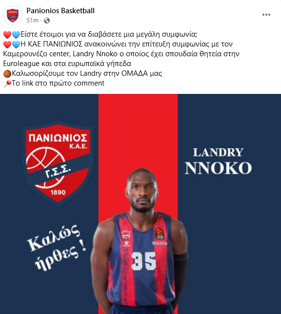 "Η ΚΑΕ ΠΑΝΙΩΝΙΟΣ βρίσκεται στην ευχάριστη θέση να ανακοινώσει την επίτευξη συμφωνίας με τον Καμερουνέζο center, Landry Christ Nnoko.