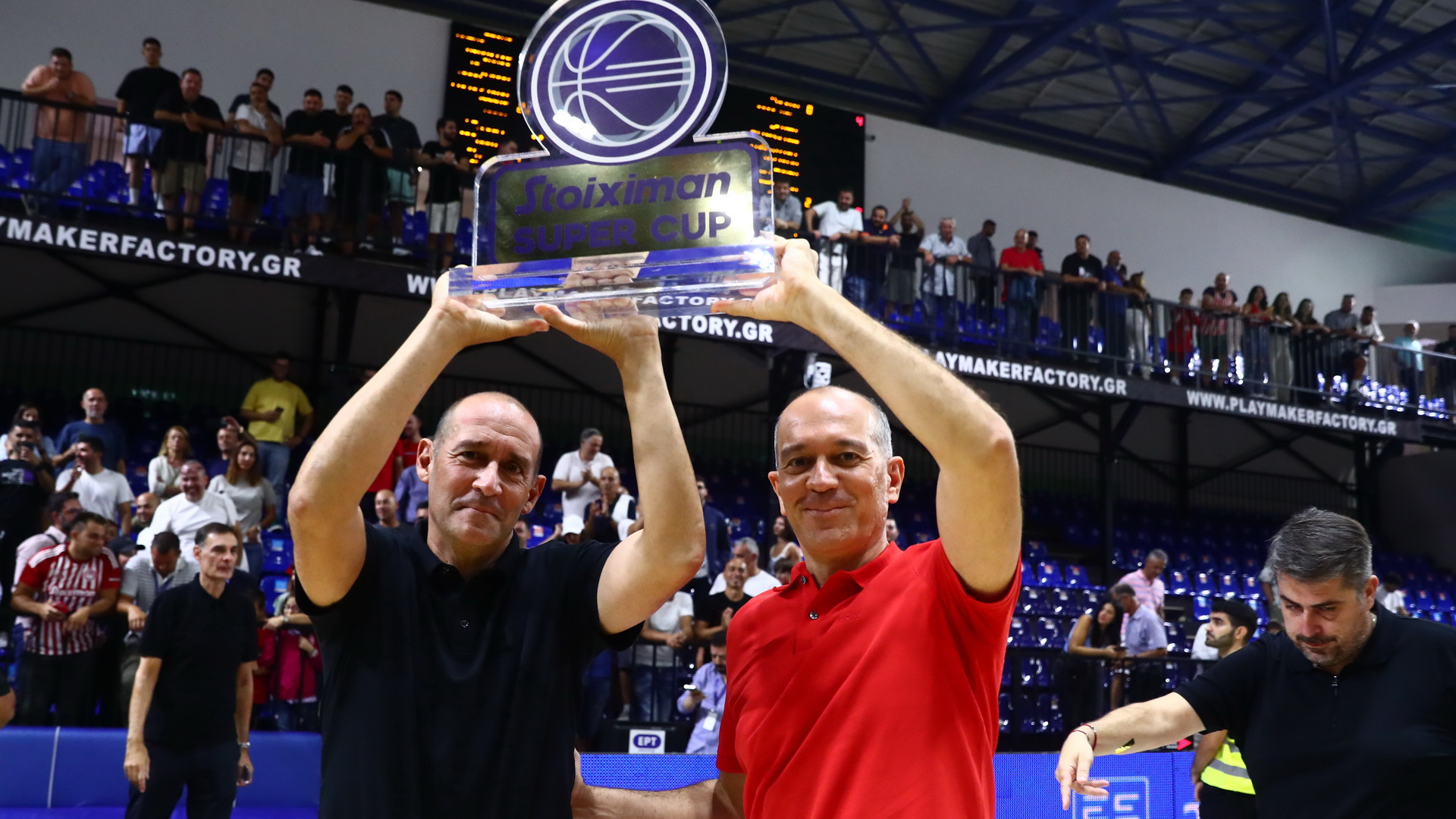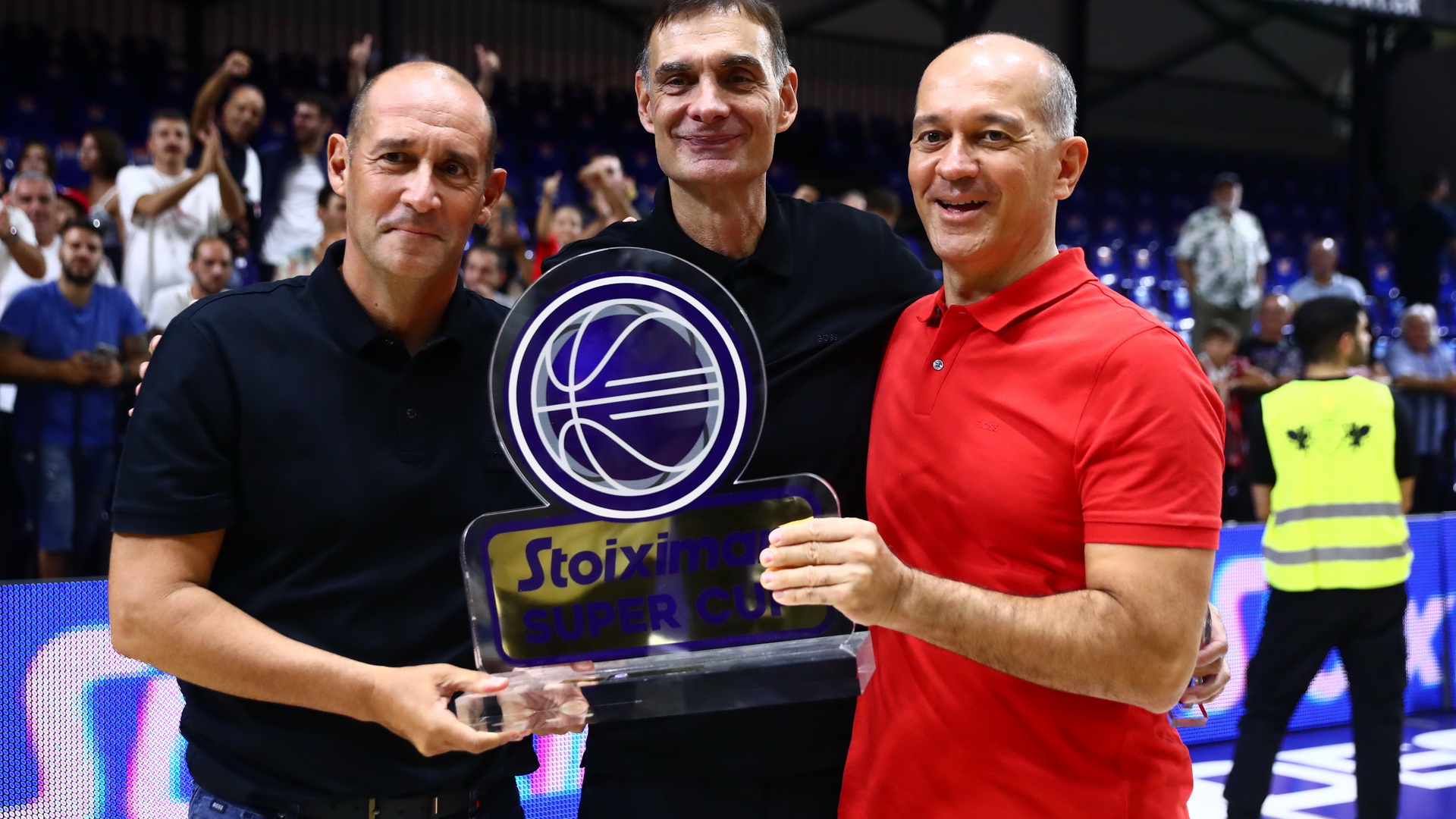 Ο Ολυμπιακός κατέκτησε το τρίτο συνεχόμενο Super Cup απέναντι στον Παναθηναϊκό, με τους Παναγιώτη και Γιώργο Αγγελόπουλο, αμέσως μετά το φινάλε του αγώνα, να πανηγυρίζουν μαζί με τον Γιώργο Μπαρτζώκα και τους παίκτες του, το βαρύτιμο τρόπαιο.