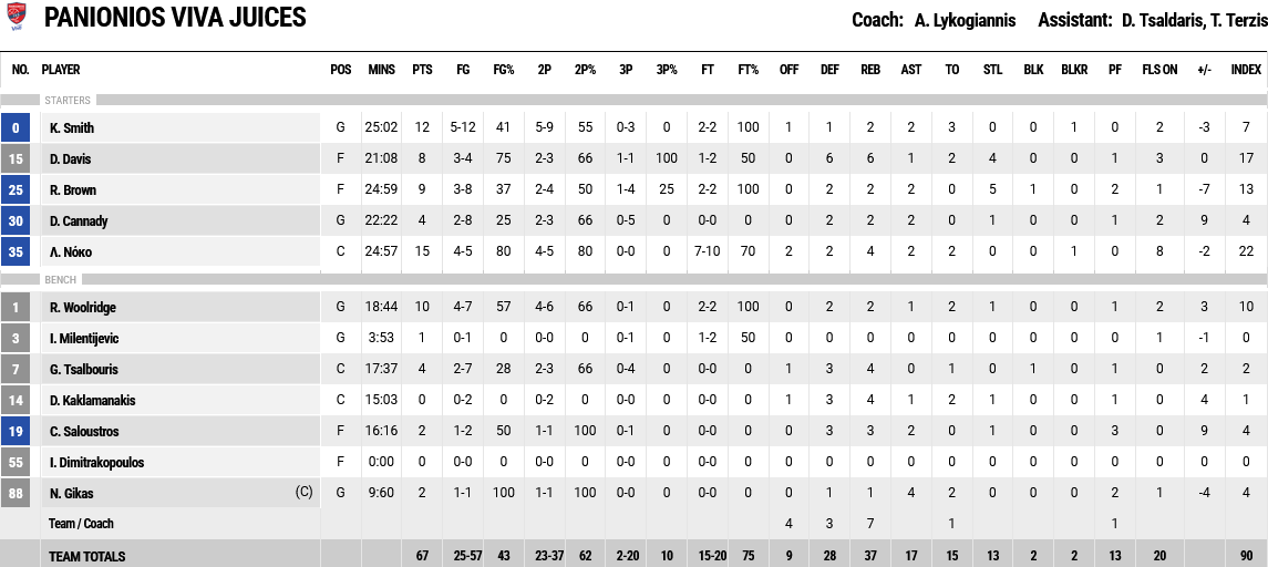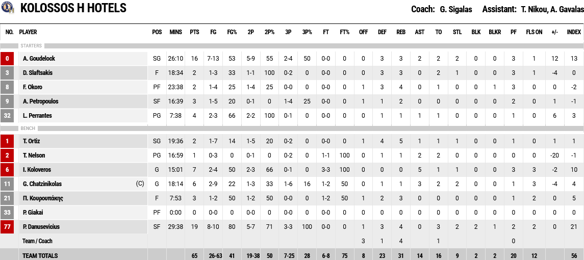 Ξεχώρισαν: Από πλευράς Πανιωνίου ο Σμιθ με 12 ποντους και ο Γουλντριτζ με 10 , ενώ από τον Κολοσσό οι Νταουσεβίτσιους και Γκάουντλοκ με 19 και 16 πόντους αντίστοιχα.