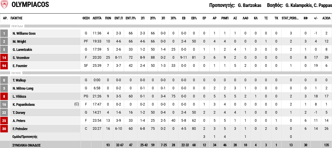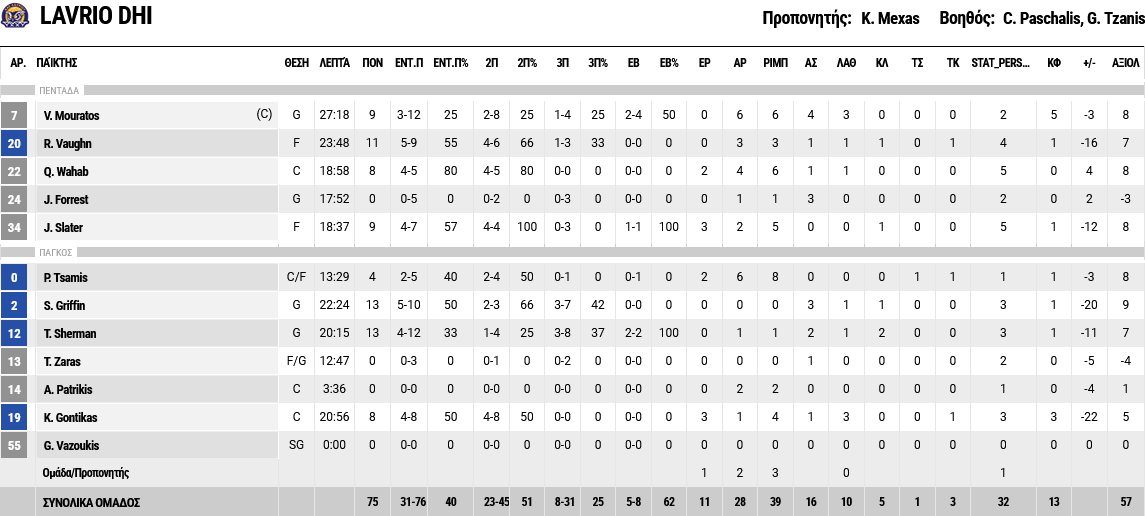 Ξεχώρισαν: 16 πόντους πέτυχε ο Πετρούσεβ και 13 ο Ράιτ, ενώ ο Βιλντόσα, με εννέα πόντους, πέτυχε τρία μεγάλα τρίποντα. Για το Λαύριο, από 13 πόντους είχαν Γκρίφιν και Σέρμαν