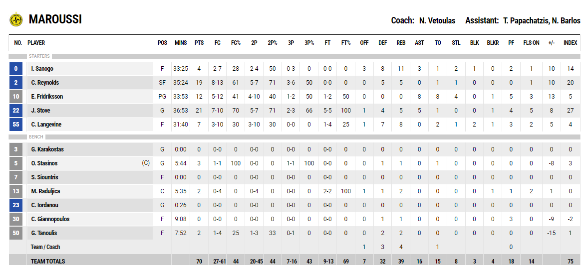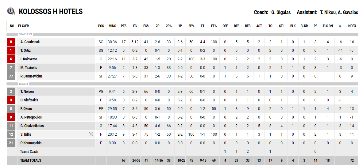Ξεχώρισαν: Από πλευράς γηπεδούχων ο Ρέινολντς με 19 πόντου και ο Φρίντρικσον με 12 πόντους και 8 ασσίστ. Από πλευράς νησιωτών ο Γκάουντλοκ είχε 17 πόντους και ακολούθησε ο Κολοβέρος με 11.