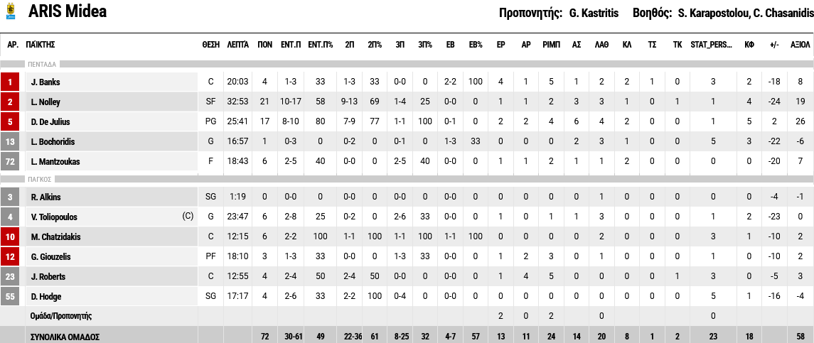 Ξεχώρισαν: Ακόμα ένα «γεμάτο» παιχνίδι από τον Βεζένκοβ με 22 πόντους και πέντε ριμπάουντ σε 20’. Συνεχίζει τις καλές εμφανίσεις ο Φουρνιέ με 11 πόντους και επτά ασίστ. Για τον Άρη, 21 πόντους είχε ο Νόλεϊ και 17 ο Ντε Τζούλιους.