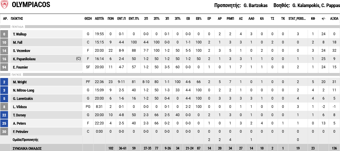 Η μεγαλύτερη διαφορά: +33 για τον Ολυμπιακό (100-67) στο 39’