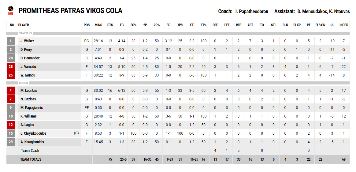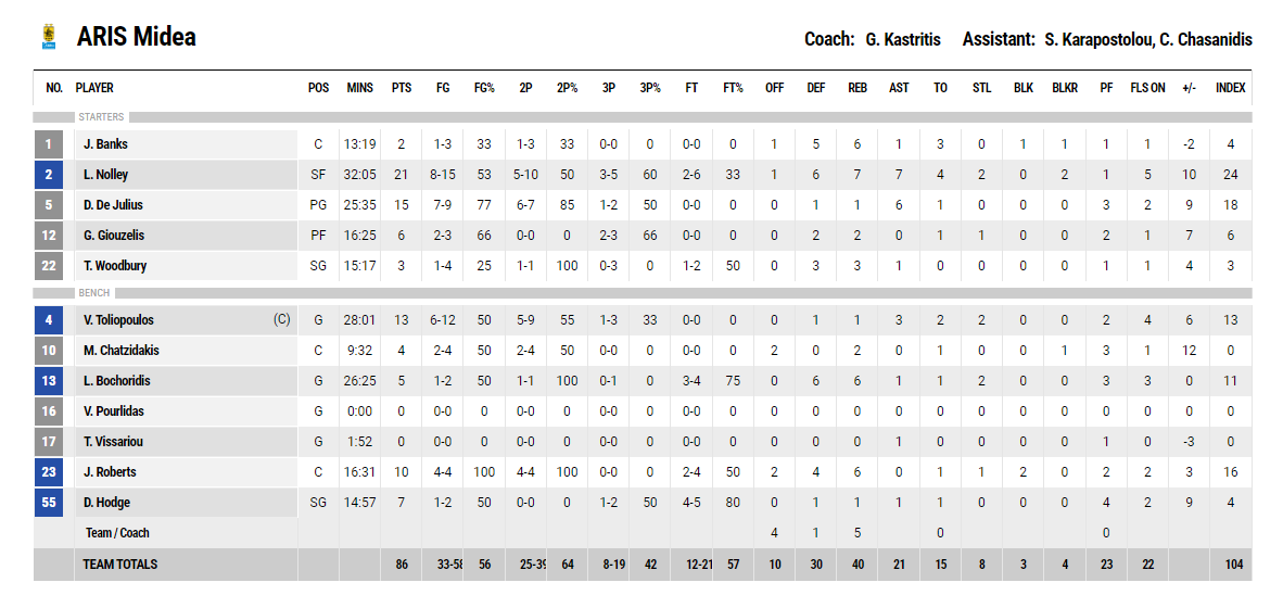 Ξεχώρισαν: Ο Ντε Τζούλιους με 15 πόντους και 6 ασσίστ και ο Τολιόπουλος με 13 πόντους ξεχώρισαν για τον Άρη. Από πλευράς φιλοξενούμενων, ο Λούντζης ήταν σε καλή μέρα με 16 πόντους και 6 ριμπάουντ και οι Γουόκερ και Βαρνάντο με 13 πόντους εκατέρωθεν.