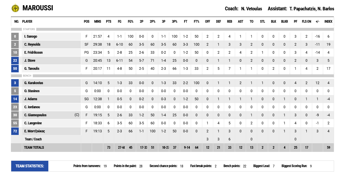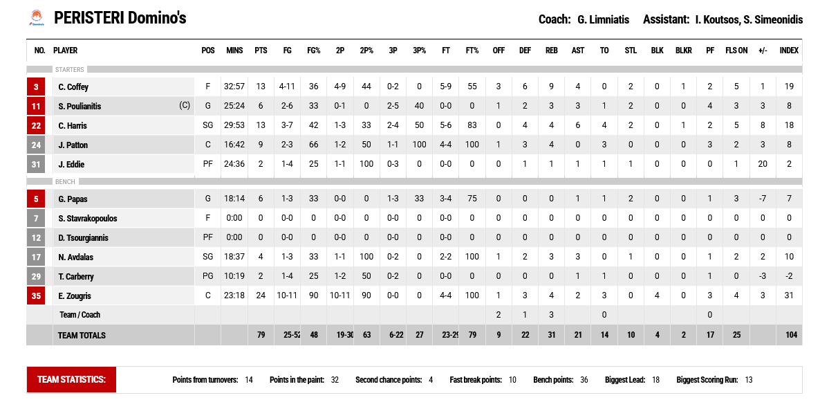 Ξεχώρισαν: Για τους νικητές συμπαραστάτες του Ζούγρη ήταν οι Κόφεϊ και Χάρις, που προσέθεσαν από 13 πόντους έκαστος, ενώ για την ομάδα του Αμαρουσίου κορυφαίος ήταν ο Ρέινολντς που σημείωσε 18 πόντους.