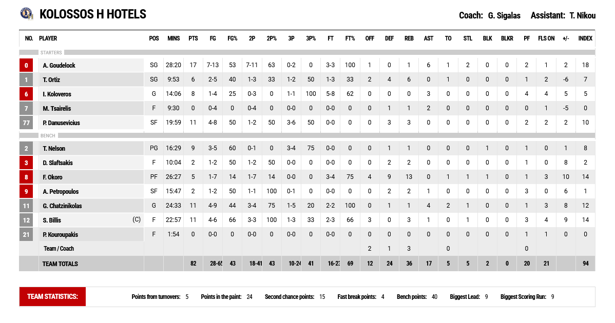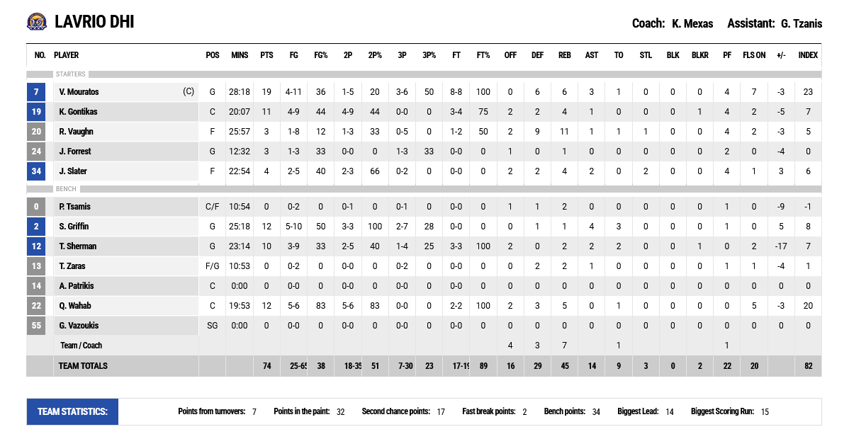 Ξεχώρισαν: Συμπαραστάτες του Γκάουντλοκ οι Ντανουσεβίτσιους, Μπιλής και Χατζηνικόλας με 11 πόντους έκαστος. Από το Λαύριο ξεχώρισε ο Μουράτος, που σημείωσε 19 πόντους ενώ μάζεψε και 6 ριμπάουντ