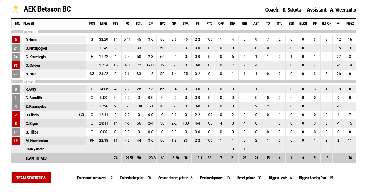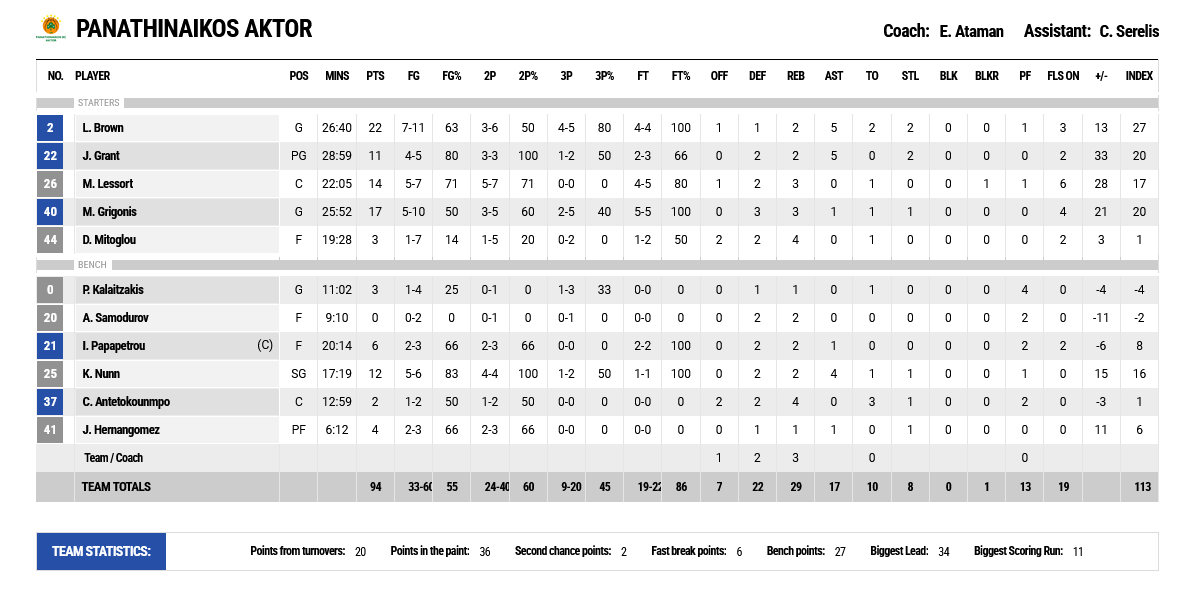 Ξεχώρισαν: Γκριγκόνις και Λεσόρ με 17 και 14 πόντους αντίστοιχα ήταν οι συμπαραστάτες του Μπράουν, ενώ από την πλευρά της ΑΕΚ ξεχώρισε ο Γκόλντεν με 16 π΄οντους και 7 ριμπάουντ