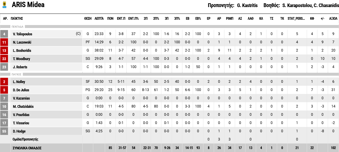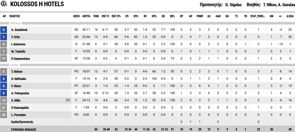 Ξεχώρισαν: 12 πόντους πέτυχε ο Νόλεϊ και από 11 οι Μποχωρίδης και Χατζηδάκης, με τον πρώτο να έχει και 11 ριμπάουντ. Για τον Κολοσσό, ο Γκάουτλοκ είχε 16 πόντους.