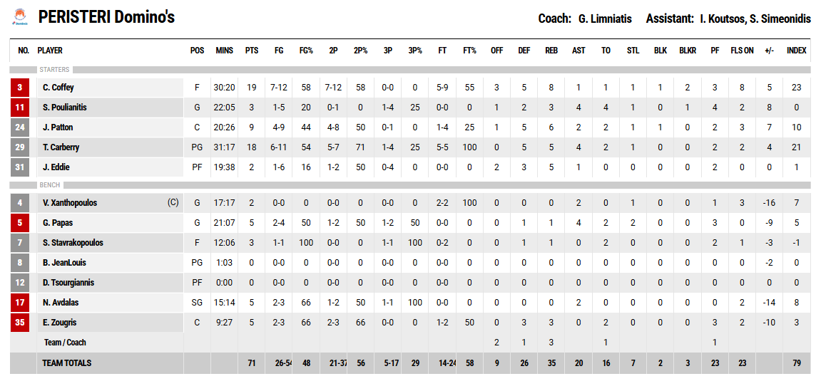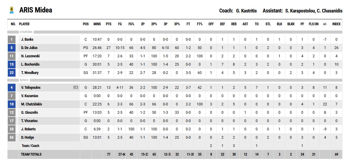 Ξεχώρισαν : Ο Τολιόπουλος με 13 πόντους και 5 ασσίστ για τον Άρη. Για το Περιστέρι ξεχώρισε ο Κόφι με 19 πόντους και 8 ριμπάουντ και ο Κάρμπερι με 18 πόντους και 5 ριμπάουντ.