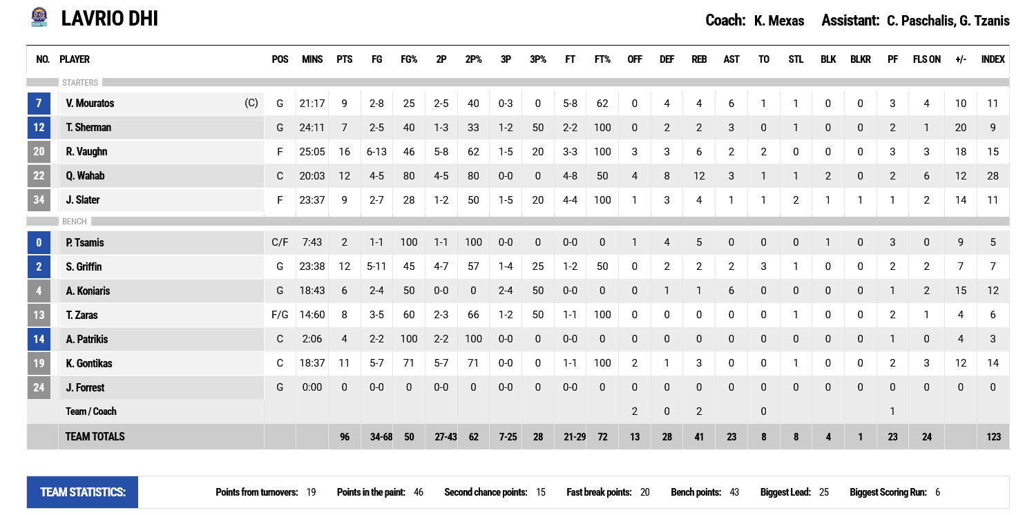 Μεγαλύτερη διαφορά: +25 για το Λαύριο, 96-71 στο 39'