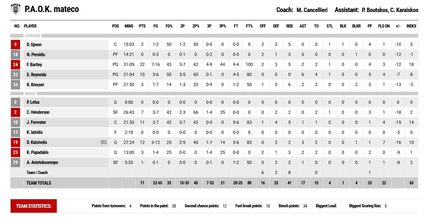 Ξεχώρισαν: Ο Γουαχάμπ με double double (12π, 12ρ) και ο Γκρίφιν με 12 ακόμη πόντους ήταν οι συμπαραστάτες του Βον, από τον ΠΑΟΚ διακρίθηκε ο Μπάρτλεϊ με 22 πόντους