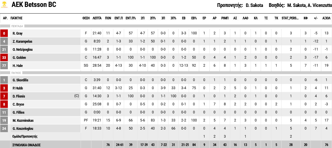 Ξεχώρισαν: Καθοριστικός ο Λούντζης με 18 πόντους, πέντε ριμπάουντ και επτά ασίστ, ενώ για την ΑΕΚ, ο Χέιλ είχε 20 πόντους και ο Κουζμίνσκας 15.
