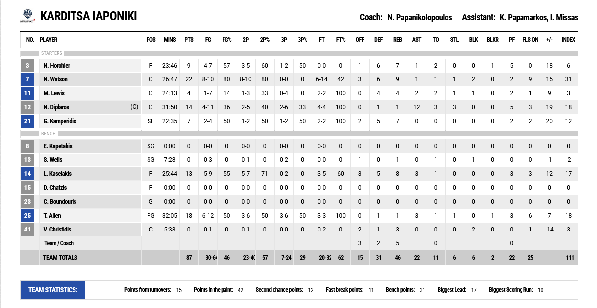 Μεγαλύτερη διαφορά: +17 υπέρ της Καρδίτσας, 87-70 στο 38'
