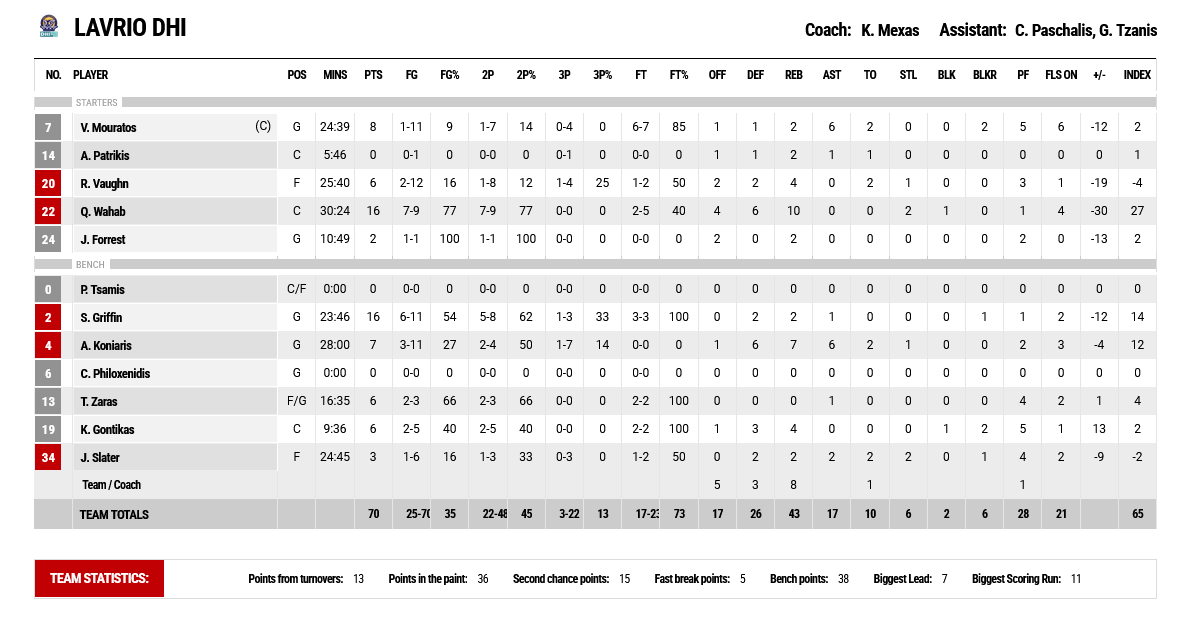 Ξεχώρισαν: Συμπαραστάτες του Γουότσον ήταν οι Άλεν και Δίπλαρος με 18 και 14 πόντους, από το Λαύριο Γουαχάμπ και Γκρίφιν είχαν από 16 πόντους