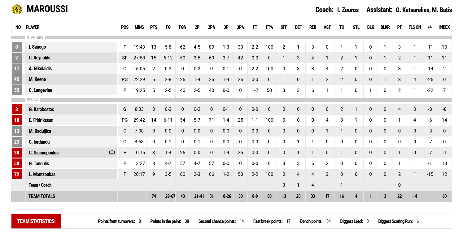 Ξεχώρισαν: Μήτογλου και Σλούκας με 17 και 15 πόντους ήταν συμπαραστάτες του Ερνανγκόμεθ, κορυφαίος του Αμαρουσίου ο Ρέινολντς με 15 πόντους και 4 ριμπάουντ