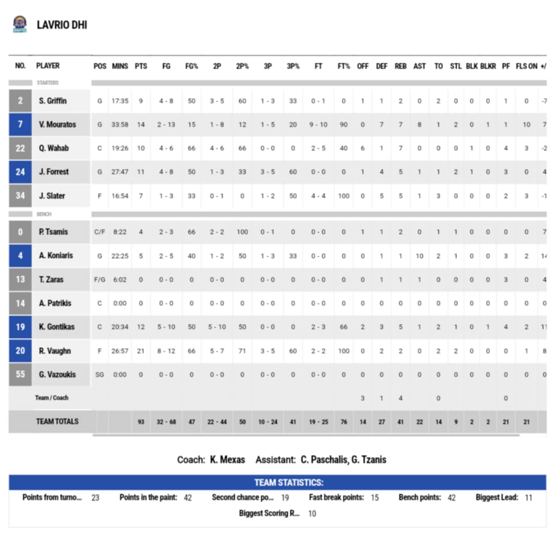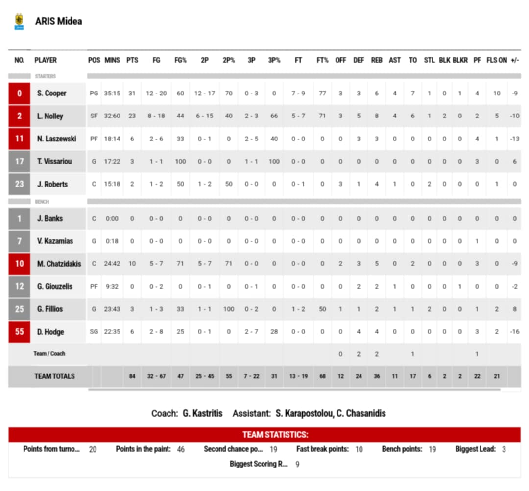 Ξεχώρισαν: Βον με 21 πόντους και Μουράτος με 14 πόντους, επτά ριμπάουντ και οκτώ ασίστ, ήταν οι κορυφαίοι του Λαυρίου. Για τον Άρη, 23 πόντους και οκτώ ριμπάουντ είχε ο Νόλεϊ