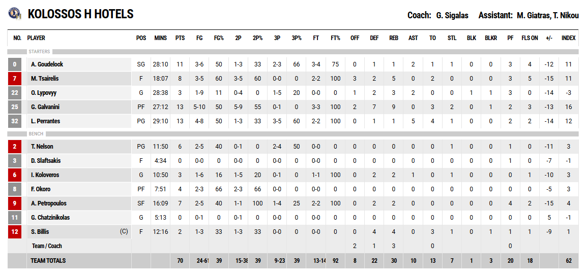 Ξεχώρισαν: Για τους γηπεδούχους ο Κατσίβελης με 17 πόντους, 5 ριμπάουντ και 7 ασσίστ. Για τους φιλοξενούμενους ξεχώρισαν ο Γκαλβανίνι με 13 πόντους και 9 ριμπάουντ και ο Περάντες με 13 πόντους.
