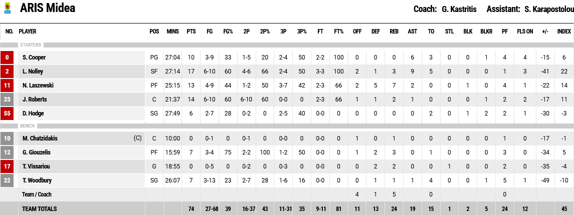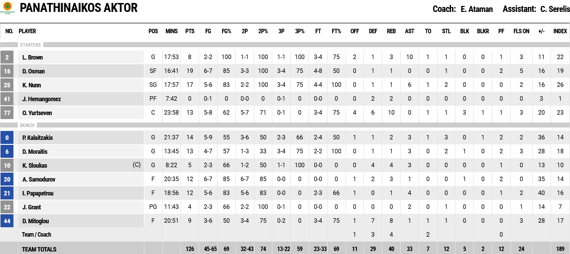 Ξεχώρισαν: Από πλευράς Παναθηναϊκού οι Ναν με 17 πόντους και 6 ασσίστ, Καλαιτζάκης με 14 πόντους και Γιούρτσεβεν με 13 πόντους και 10 ριμπάουντ. Από πλευράς Άρη ο Νόλλει είχε 17 πόντους Ρόμπερτς 14.