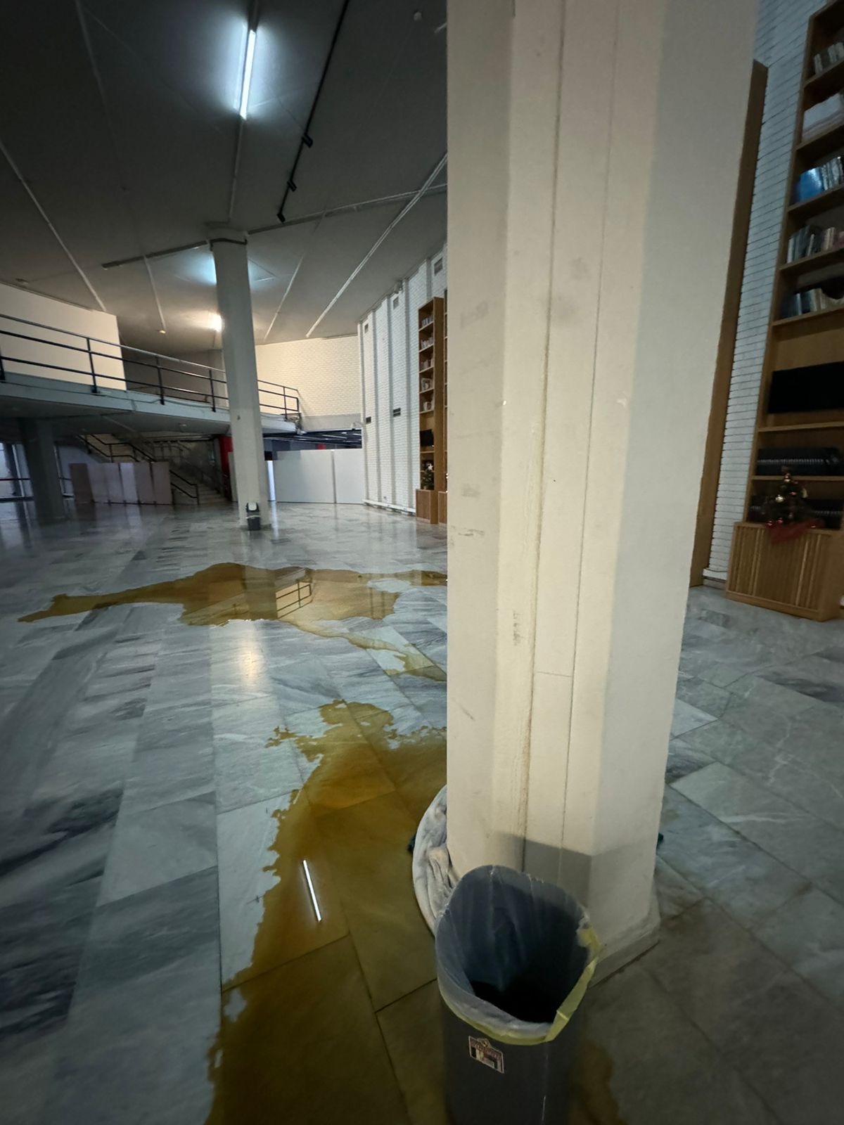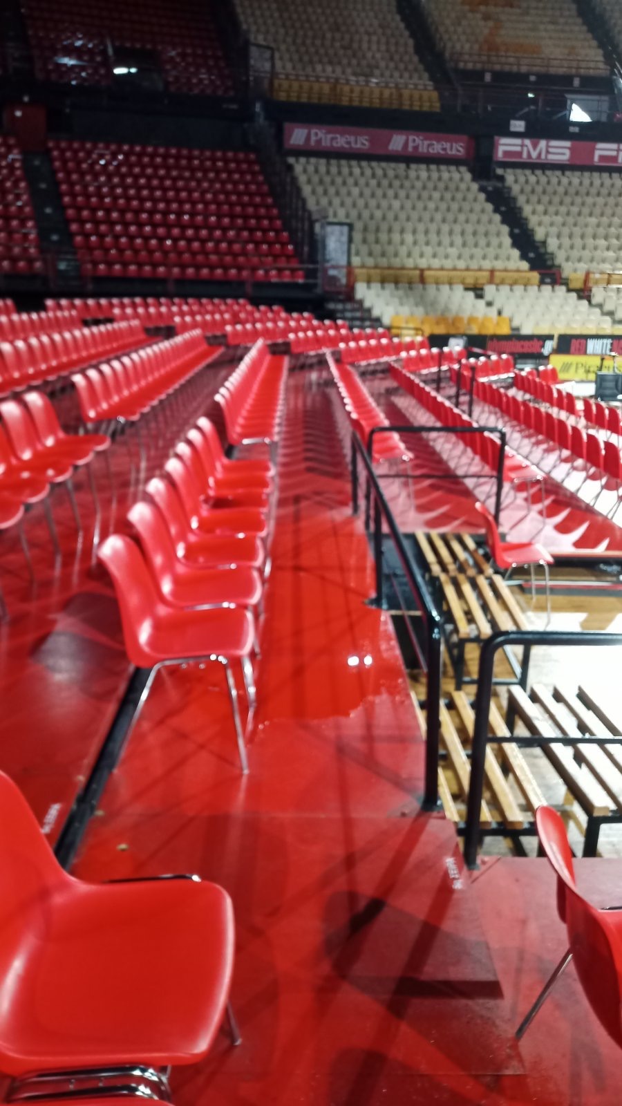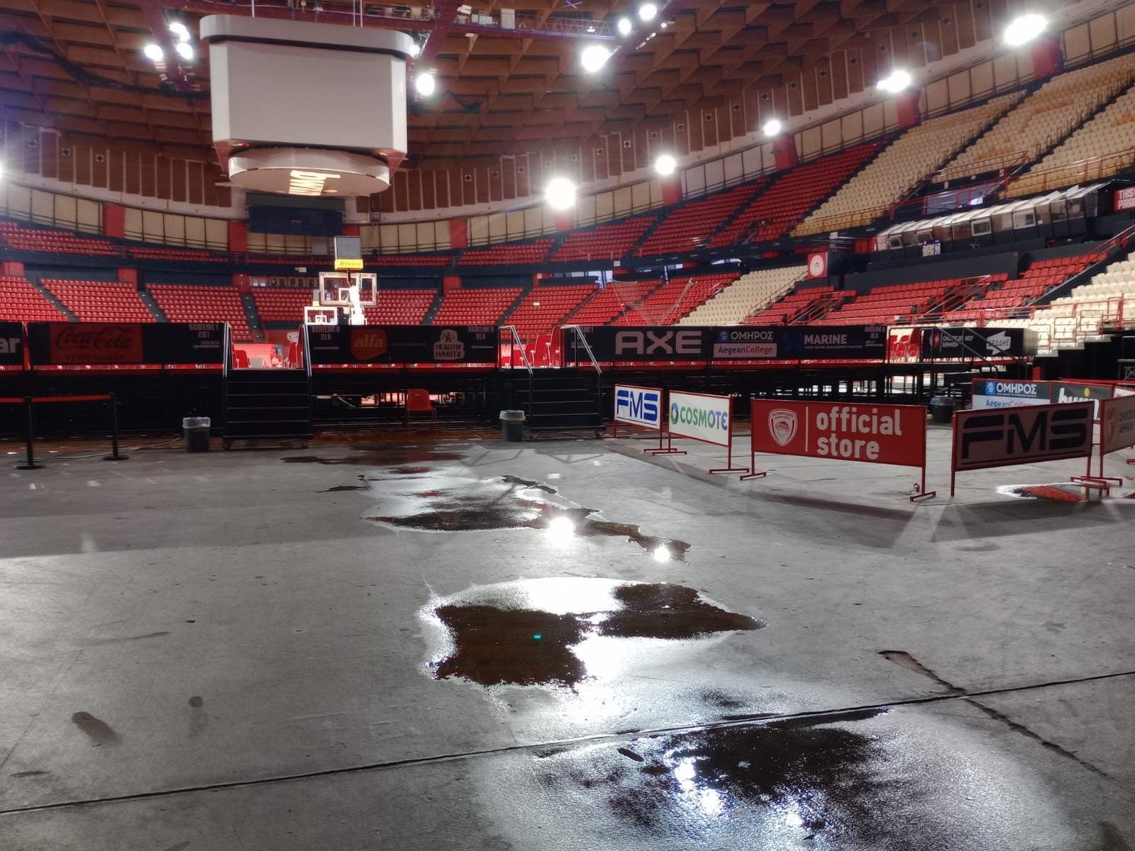 Συγκεκριμένα, η οροφή του φαληρικού κλειστού στάζει από πάρα πολλά σημεία, κάτι που είχε ως αποτέλεσμα να προκληθούν μεγάλες ζημιές, τόσο στο παρκέ, όσο και το cube του σταδίου, αλλά ακόμα και στο γυμναστήριο της ομάδας, στο οποίο βρίσκονται υπερσύγχρονα μηχανήματα, τα οποία έχει πληρώσει η ΚΑΕ Ολυμπιακός.