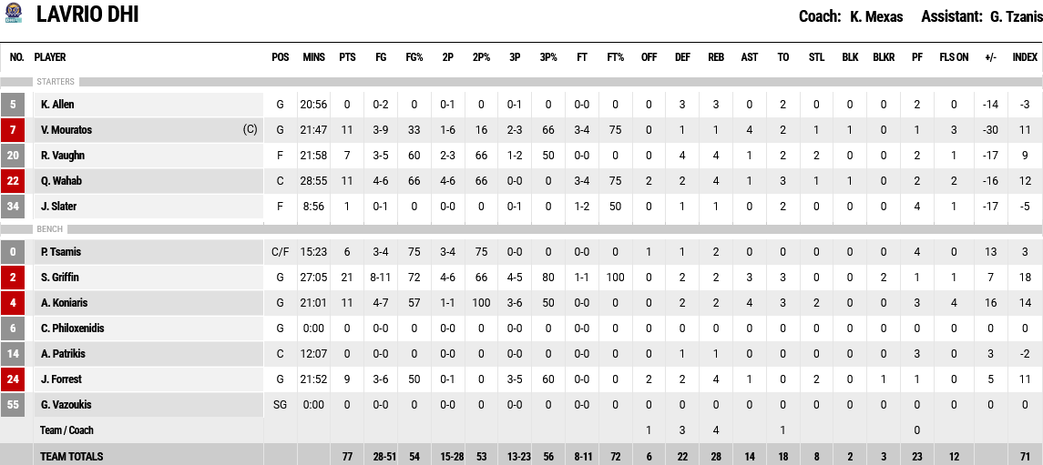 Ξεχώρισαν: 15 πόντους πέτυχε ο Ντόρσεϊ, με τον Φαλ να έχει 12, όσους πέτυχε και ο Νέιθαν Μένσα, ο οποίος είχε και επτά ριμπάουντ, στο ντεμπούτο του. Για το Λαύριο, ο Γκρίφιν είχε 21 πόντους.