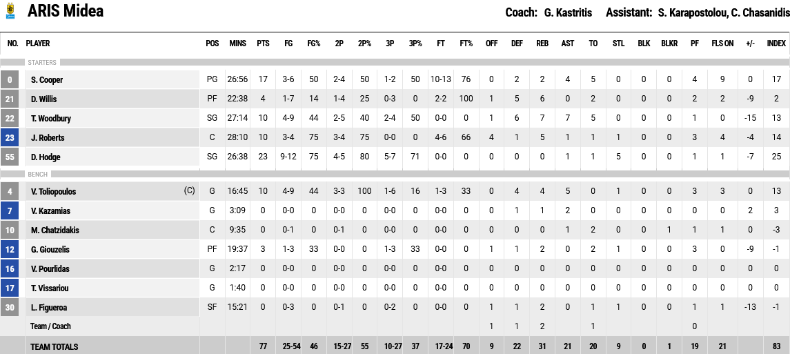 Ξεχώρισαν: Εξαιρετικός ο Πίτερς με 18 πόντους σε κάτι παραπάνω από 12’ συμμετοχής. Για τον Άρη, ο Χοτζ ήταν ασταμάτητος, με 23 πόντους, με τον Κούπερ να ακολουθεί με 17.