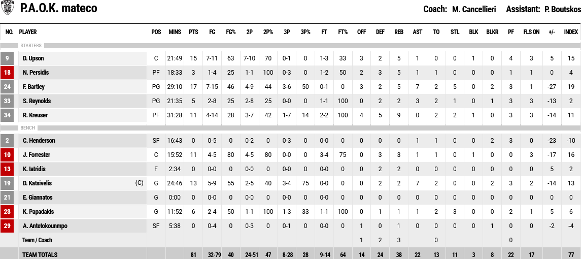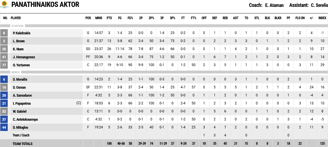 Ξεχώρισαν: Ακόμα ένα σπουδαίο ματς από τον Γιούρτσεβεν, με 19 πόντους, με τον Μπράουν να έχει 13 πόντους. Για τον ΠΑΟΚ, Μπάρτλει και Άπσον είχαν 17 και 15 πόντους αντίστοιχα.