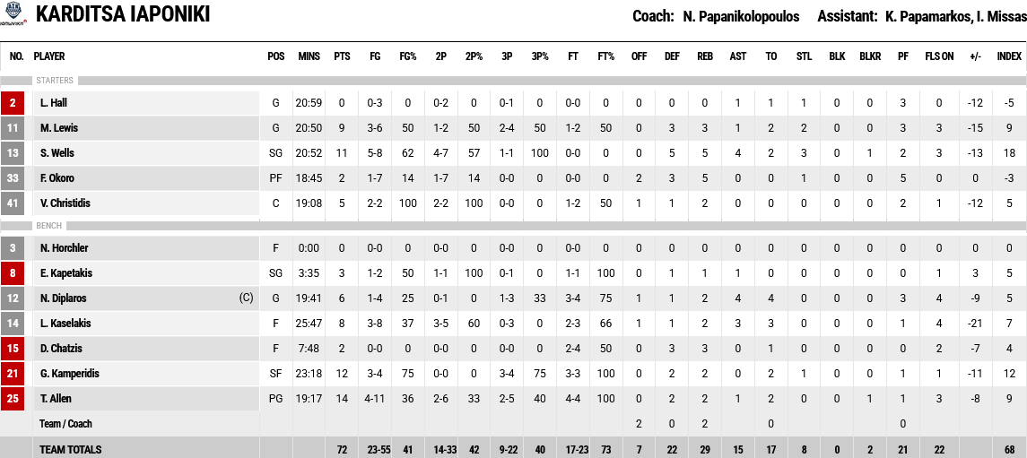 Ξεχώρισαν: Επιστροφή στις καλές εμφανίσεις για τον Τάιλερ Ντόρσεϊ,με 14 πόντους, τέσσερα ριμπάουντ και ισάριθμα κλεψίματα, ενώ 11 πόντους είχε ο Λαρεντζάκης και 10 ο Βεζένκοβ. Για την Καρδίτσα, 14 πόντους είχε ο Άλεν και 12 ο Καμπερίδης.