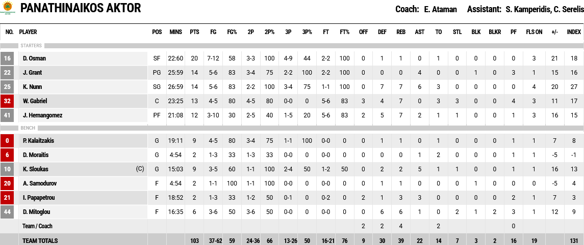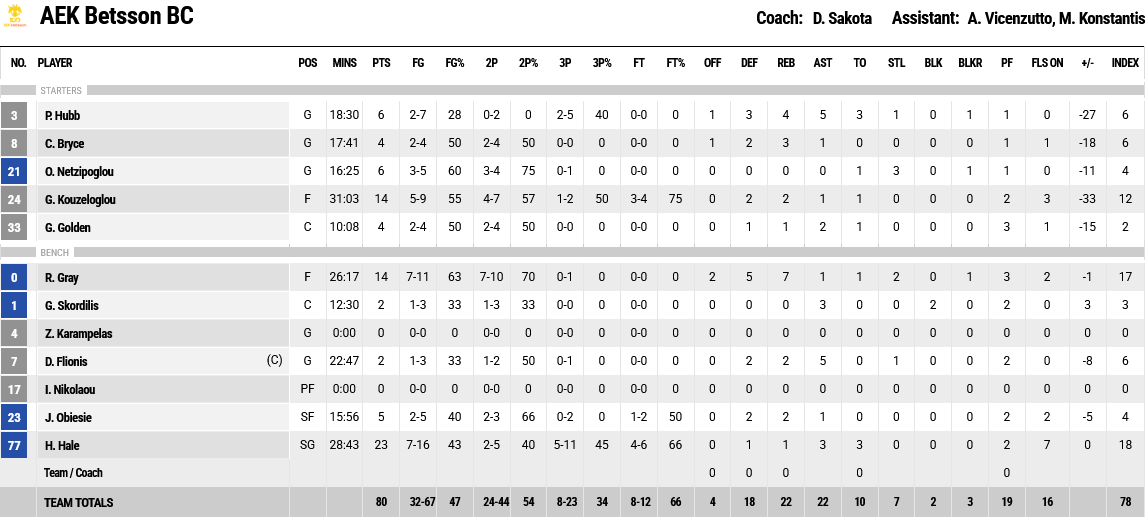 Ξεχώρισαν: Από 14 πόντους είχαν Γκραντ και Ναν, με τον Γκάμπριελ να προσθέτει 13 και τον Ερνανγκόμεθ 12 πόντους. Για την ΑΕΚ, 23 πόντους πέτυχε ο Χέιλ και από 14 οι Γκρέι και Κουζέλογλου.