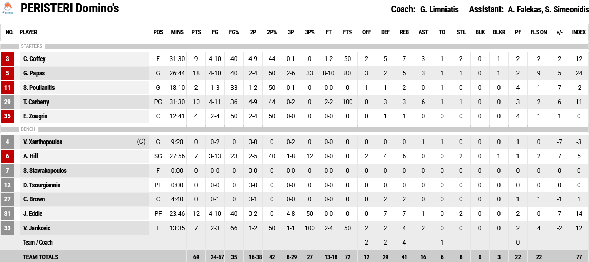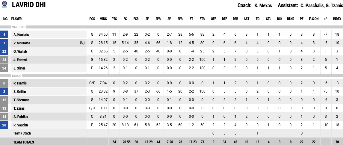 Ξεχώρισαν: 12 πόντους σημείωσε ο Έντι και 10 ο Κάρμπερι, ενώ για το Λαύριο, 20 πόντους σημείωσε ο Βον και 15 ο Μουράτος.
