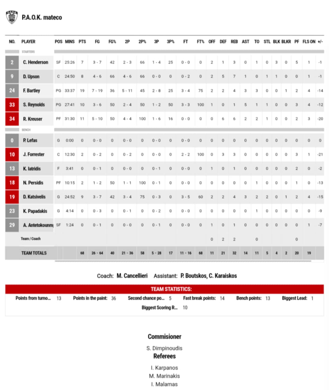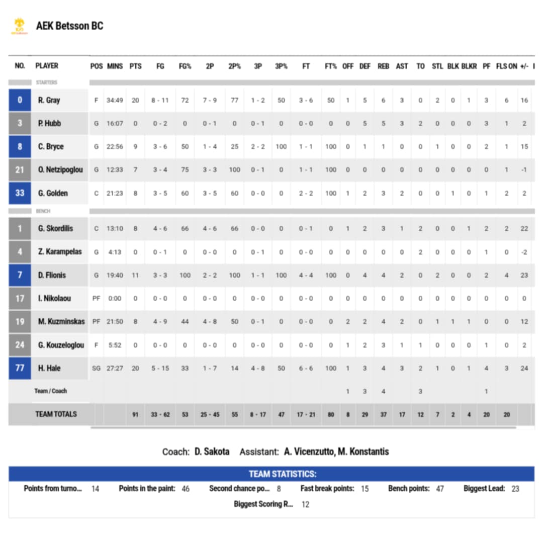 Ξεχώρισαν: Πέρα από τους Γκρέι και Χέιλ, η ΑΕΚ είχε επίσης από τον Φλιώνη και Μπρις 11 και 9 πόντους αντίστοιχα. Από τον ΠΑΟΚ διακρίθηκαν οι Μπάρτλει και Κρούζερ με 19 και 11 πόντους.