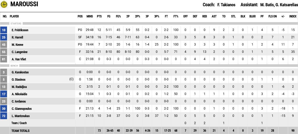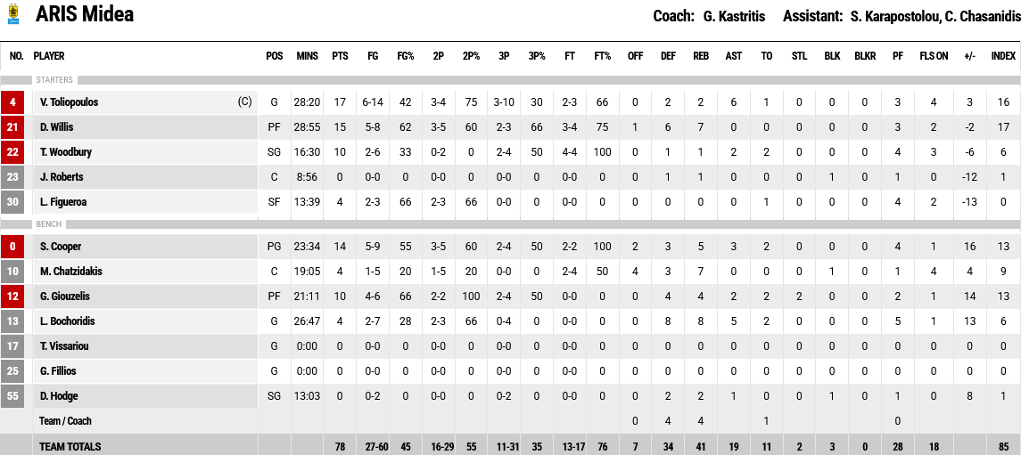 Ξεχώρισαν: Από τον Άρη διακρίθηκαν οι Τολιόπουλος και Γουίλις με 17 και 15 πόντους αντίστοιχα. Από το Μαρούσι, επίσης είχε ο Χάρελ 16 πόντους και ο Φρίντρικσον σκόραρε 12 πόντους.