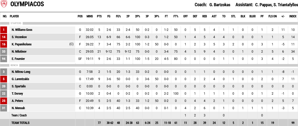 Ο Προμηθέας έβαλε (πολύ) δύσκολα στον Ολυμπιακό, όμως οι Πατρινοί βρήκαν απέναντι τους τον ασταμάτητο Νίκολα Μιλουτίνοβ, αλλά και τον Γιαννούλη Λαρεντζάκη, που με καθοριστικά τρίποντα στην τελευταία περίοδο, κράτησε τους Πειραιώτες σε θέση οδηγού μέχρι το φινάλε (74-77).