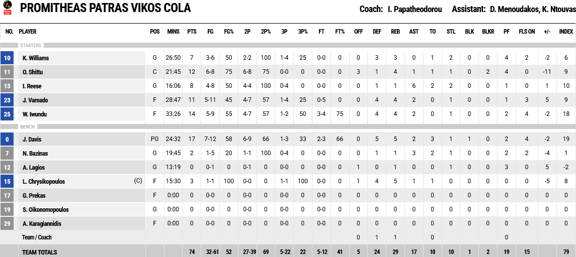 Ξεχώρισαν: 13 πόντους πέτυχε ο Βεζένκοβ, ενώ ο Γιαννούλης Λαρεντζάκης πέτυχε εννέα πόντους, με τρία καθοριστικά τρίποντα στην τελευταία περίοδο. Για τον Προμηθέα, 17 πόντους πέτυχε ο Ντέιβις.