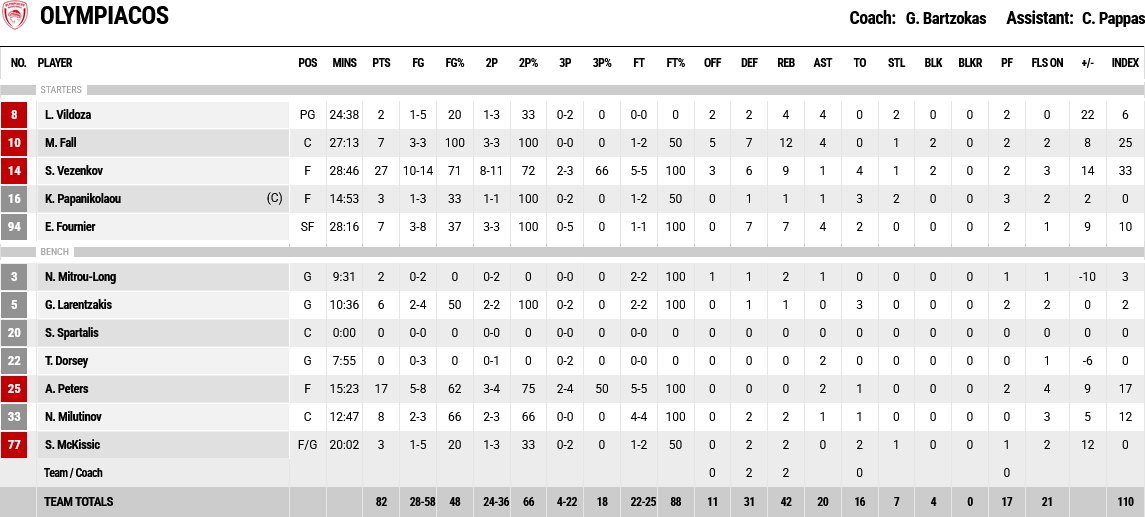 Ξεχώρισαν: Καθοριστικός στο φινάλε ο Πίτερς με 17 πόντους, ενώ ο Φαλ είχε επτά πόντους και 12 ριμπάουντ. Για το Περιστέρι, ο Πάπας είχε 13 πόντους.