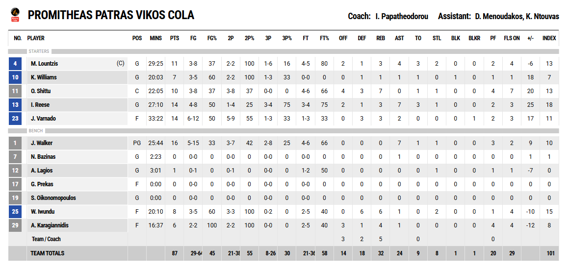 Ξεχώρισαν: Για τους γηπεδούχους ο Βαρνάντο με 14 πόντους και ο Γουόκερ με 16 πόντους και 7 ασσίστ. Για τον ΠΑΟΚ ξεχώρισε ο Μπάρτλει με 15 πόντους, 5 ριμπάουντ και 5 ασσίστ και ο Ρέινολντς με 15 πόντους και 5 ασσίστ.