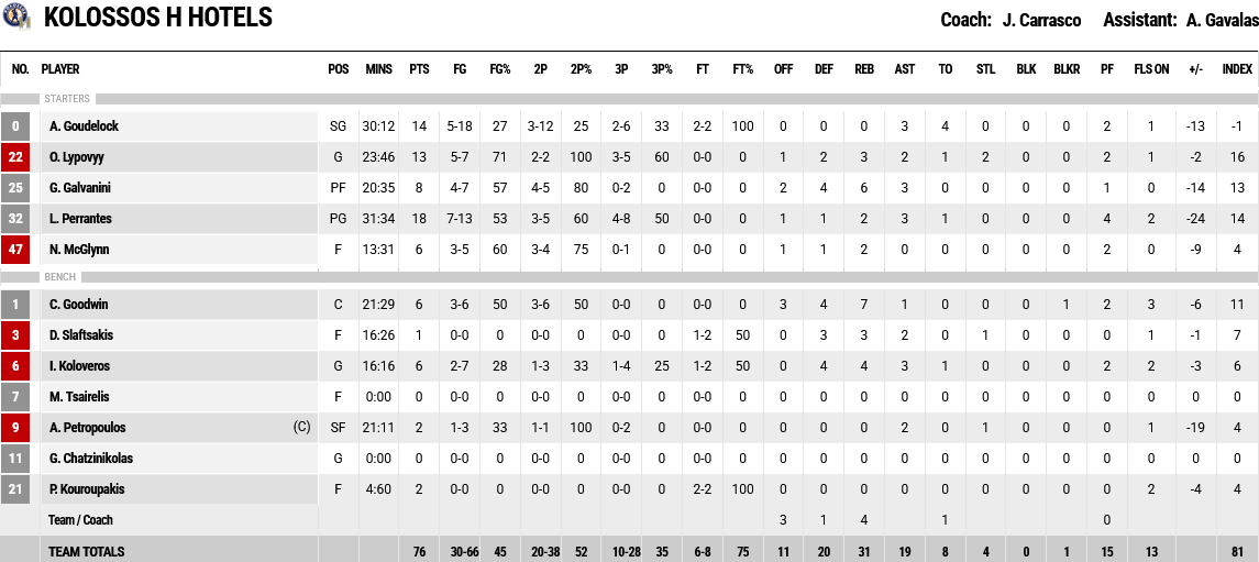 Ξεχώρισαν: 11 πόντους σημείωσε ο Σάσα Βεζένκοβ, ενώ για τον Κολοσσό, 18 πόντους πέτυχε ο Περάντες, 14 ο Γκάουντλοκ και 13 ο Λίποβι.