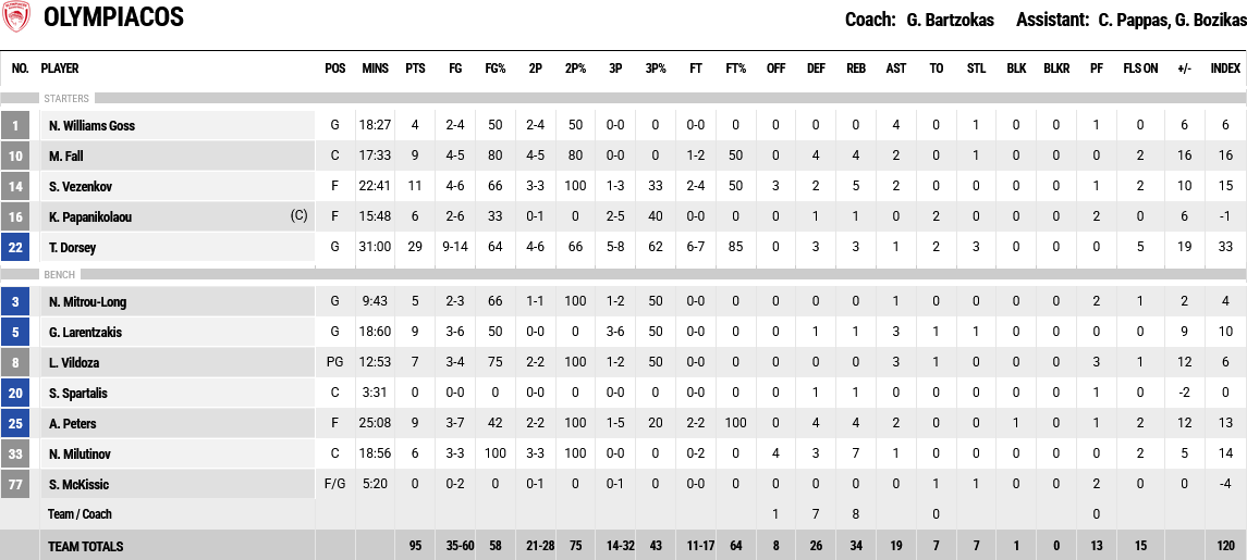 Η μεγαλύτερη διαφορά: +23 για τον Ολυμπιακό (95-72) στο 39’