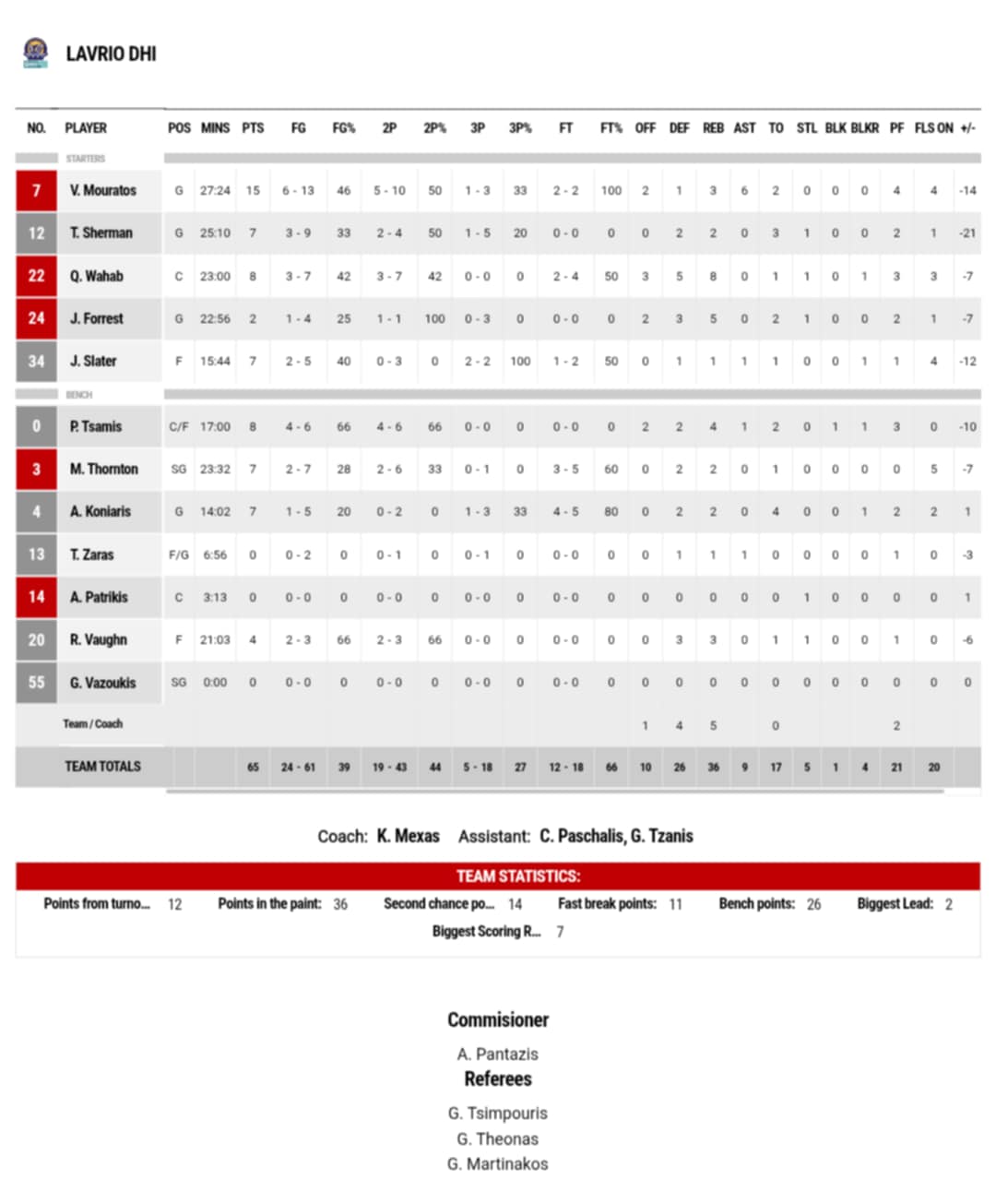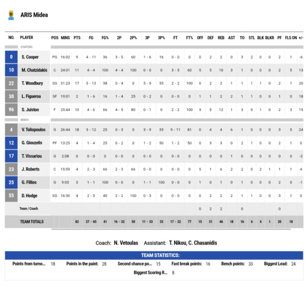 Ξεχώρισαν: Από τον Άρη διακρίθηκαν ο Γούντμπερι (17 πόντοι), ο Χατζηδάκης (11 πόντοι και 10 ριμπάουντ) και Τζούστον (10 πόντοι και 12 ριμπάουντ) αντίστοιχα. Από το Λαύριο σκόραρε ο Μουράτος με 15 πόντους, με τους Τσάμη και Γουαχάμπ να έχουν από 8 πόντους έκαστος.
