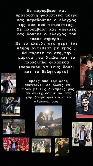 «Με παρέμβαση και πρωτοφανή φασιστικά μέτρα, σας παραδόθηκε ο έλεγχος της ΕΟΚ προ τετραετίας. Με παρέμβαση και απειλές, σας δόθηκε ο έλεγχος του ΕΣΑΚΕ σήμερα… Με το κλειδί στο χέρι (σε πλήρη αντίθεση με εμάς) θα πάρετε το ΣΕΦ, τη μαρίνα, τα δίπλα και τα παραδίπλα οικόπεδα (παρακαλώ να τους δοθεί και το δελφινάριο). Εμείς, από την άλλη, απέναντι σε όλους και μόνο με τις δυνάμεις μας, θα συνεχίζουμε να σας χαρίζουμε φωτό για τ άλμπουμ σας», αναφέρει η ανάρτηση του Δημήτρη Γιαννακόπουλου.