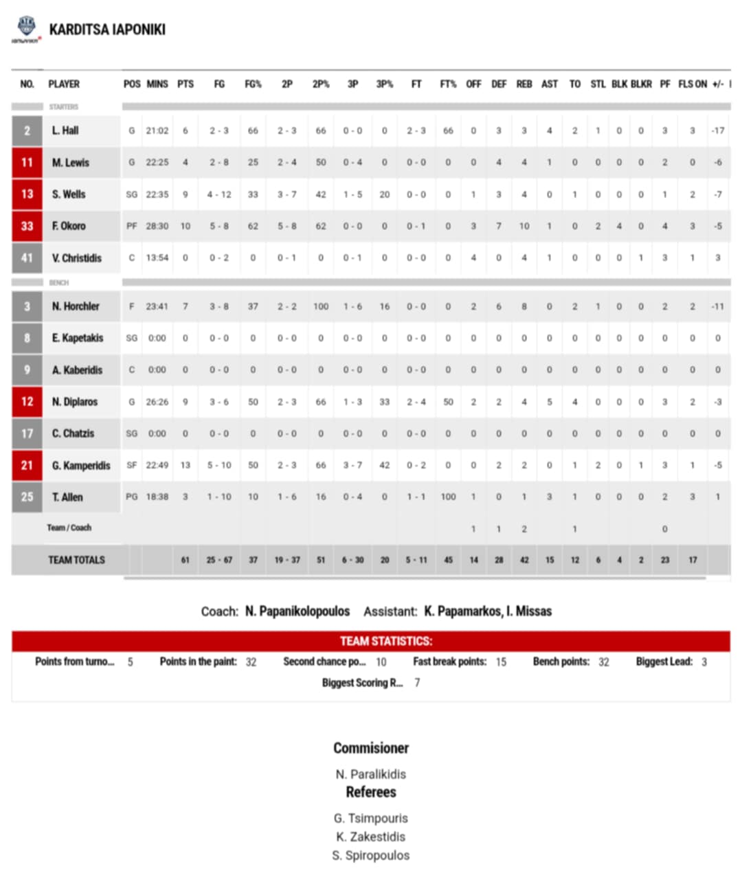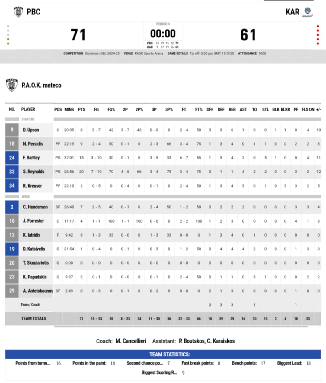 Ξεχώρισαν: Από τον ΠΑΟΚ σκόραραν ο Μπάρτλει και ο Περσίδης με 15 και εννέα πόντους αντίστοιχα. Από την Καρδίτσα σκόραραν ο Καμπερίδης και ο Οκόρο (10 ριμπάουντ και 1 ασίστ) 13 και 10 πόντους.