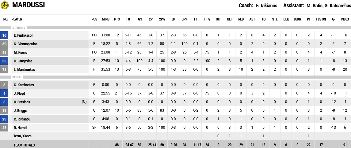Ξεχώρισαν: Ντόρσεϊ και Λονγκ, με 15 και 14 πόντους αντίστοιχα, άρπαξαν τις ευκαιρίες που τους δόθηκαν, όπως και ο Λαρεντζάκης με 18. Για το Μαρούσι, των έξι «διψήφιων» παικτών, ο Φλόιντ είχε 21 πόντους και ο Μαντζούκας 13.