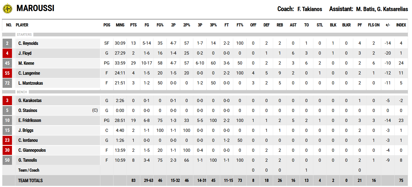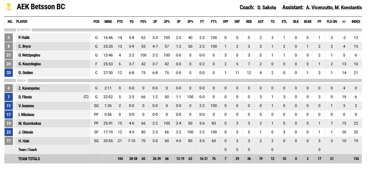 Ξεχώρισαν: Από την ΑΕΚ ο Μιντάουγκας Κουζμίνσκας με 15 πόντους και ο Γκραντ Γκόλντεν με 12 ριμπάουντ, ενώ από το Μαρούσι ο Μάρκους Κιν με 29 πόντους και 6-10 τρίποντα