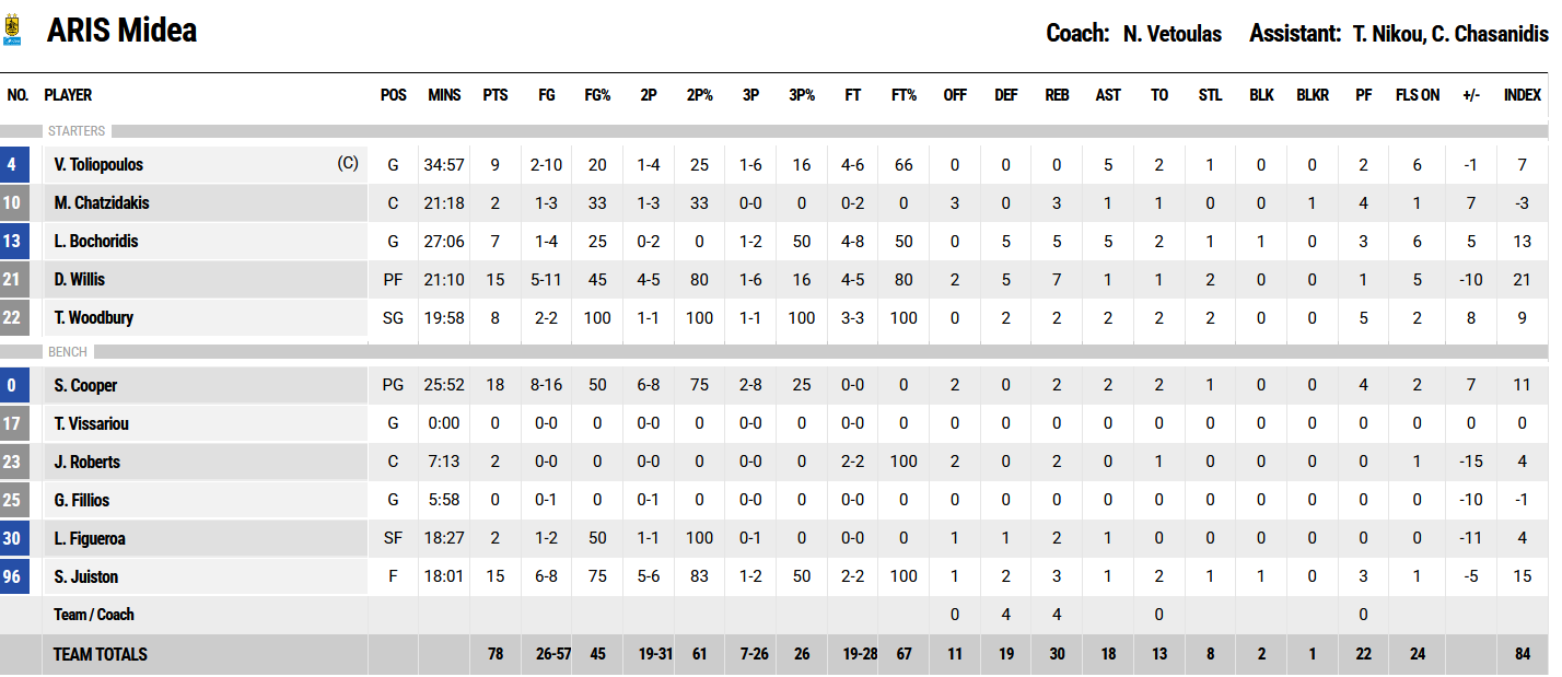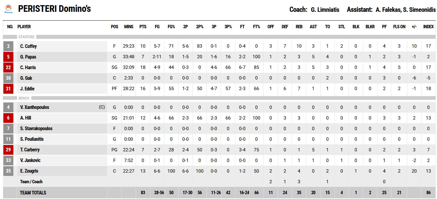 Ξεχώρισαν: Από το Περιστέρι ο Τζάρελ Έντι με 16 πόντους και 7 ριμπάουντ και ο Κρις Κόφι με 10 πόντους και 10 ριμπάουντ. Από τον Άρη ο Ντάρλεν Γουίλις με 15 πόντους και 7 ριμπάουντ και ο Σαρίφ Κούπερ με 18 πόντους.